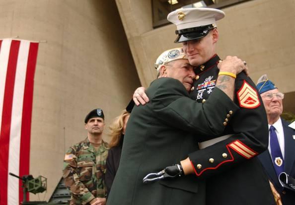 Pearl Harbor survivor hugs Iraq war veteran, Dallas, Texas (2005)